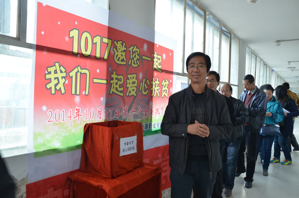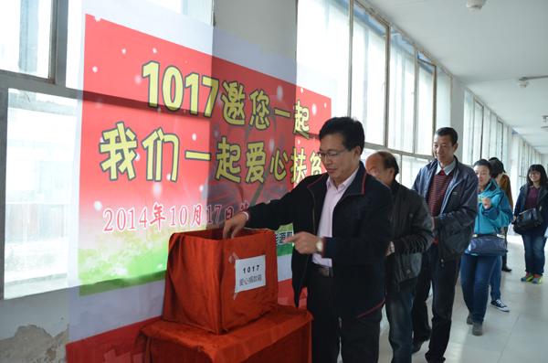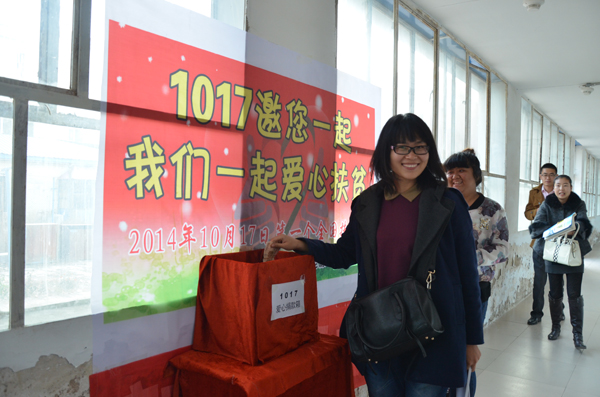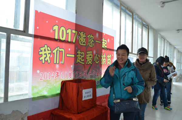 我校先后召開專題工作會議,即班子會、全體教師會、班干部會,使全校師生思想統一、使扶貧助學觀念深入人心。同時,通過校園宣傳欄、校園廣播、主體班會等形式發出“1017,邀您一起,我們一起愛心扶貧”活動倡議,并結合我國貧困地區的生活情況以及社會上“獻愛心”的具體事例,激發學生獻愛心的熱情,營造扶貧幫困的良好氛圍,爭取廣大師生的理解與參與。