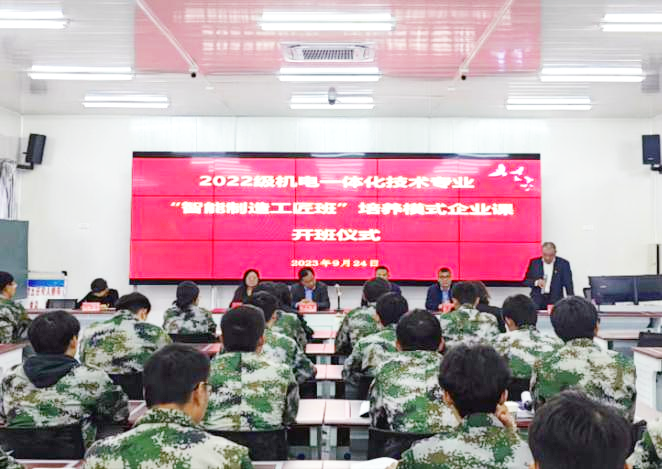 機(jī)電一體化專業(yè)帶頭人、“智能制造工匠班”導(dǎo)師付曉波首先感謝企業(yè)領(lǐng)導(dǎo)的支持和精心組織,并對派駐學(xué)院授課的企業(yè)專家表示熱烈歡迎。還介紹了什么是智能制造,以及智能制造未來的發(fā)展方向如何等專業(yè)情況,同時(shí)也對學(xué)生提出了要求,希望珍惜這次企業(yè)課程的學(xué)習(xí)機(jī)會(huì),嚴(yán)格遵守工匠班管理制度,積極與老師交流互動(dòng),達(dá)到最優(yōu)學(xué)習(xí)效果。