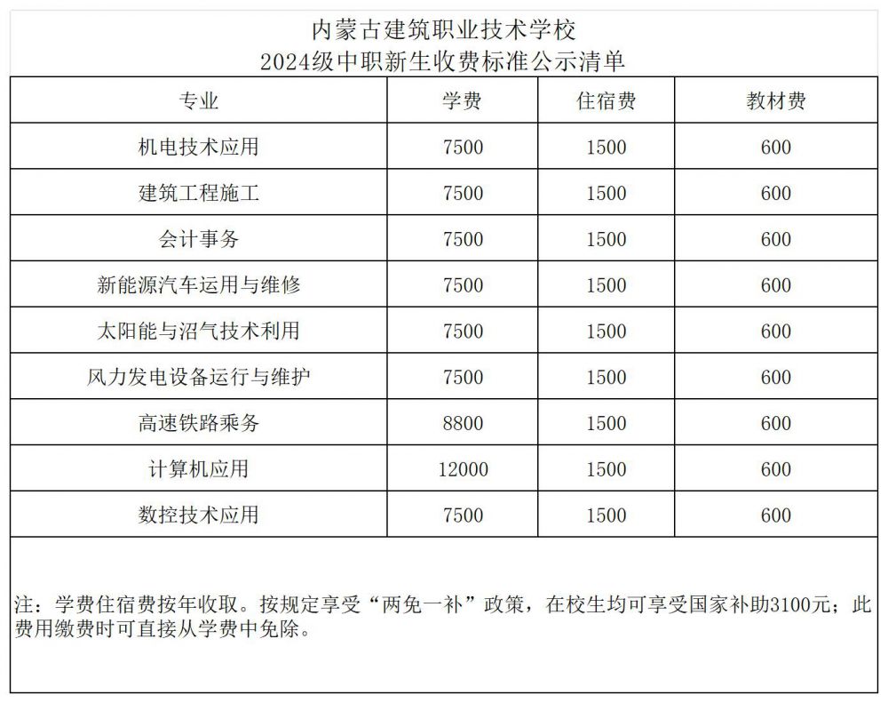 內蒙古建筑職業技術學校2024級中職新生收費標準公示清單