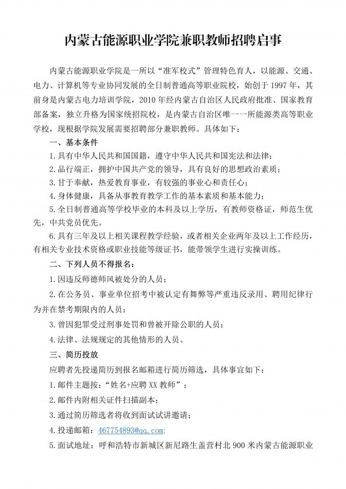內(nèi)蒙古能源職業(yè)學院兼職教師招聘啟事