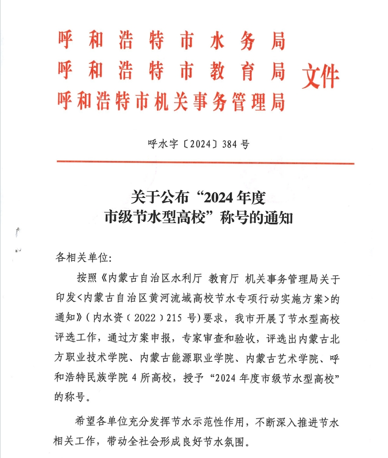 經過長達數月的精心籌備與不懈努力,我院成功被授予“2024年度市級節水型高校”的榮譽稱號。這一榮譽的獲得,不僅是對我院在節約用水方面所做努力的肯定,更是對全體師生共同奮斗精神的褒獎。