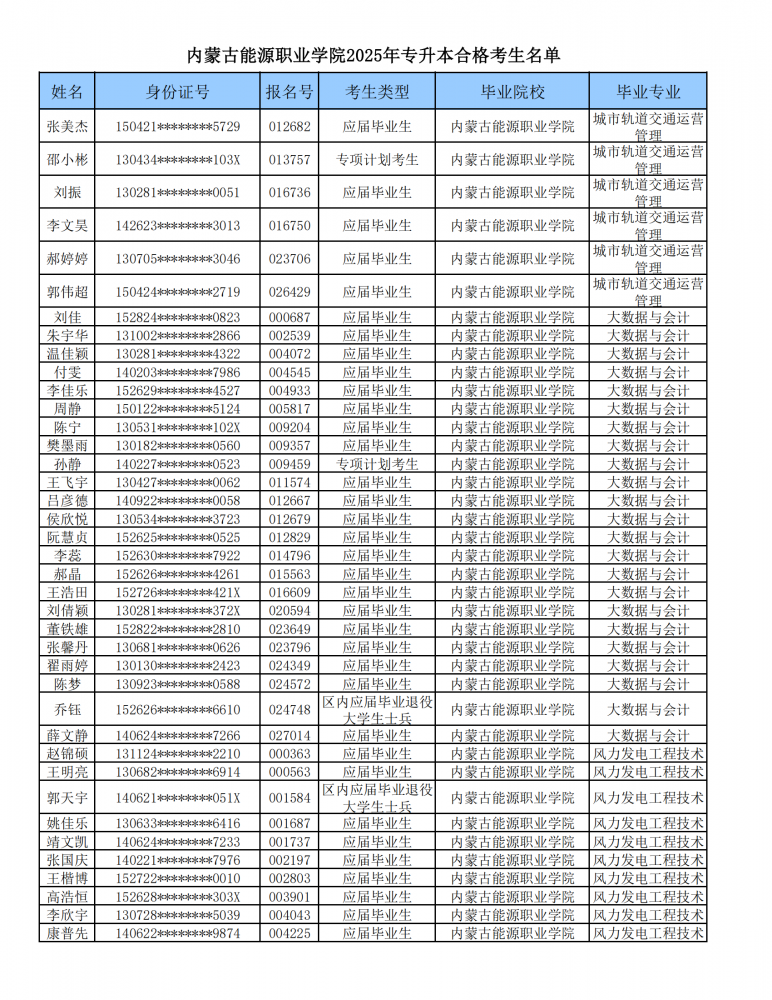 內蒙古能源職業學院2025年專升本合格考生名單公示