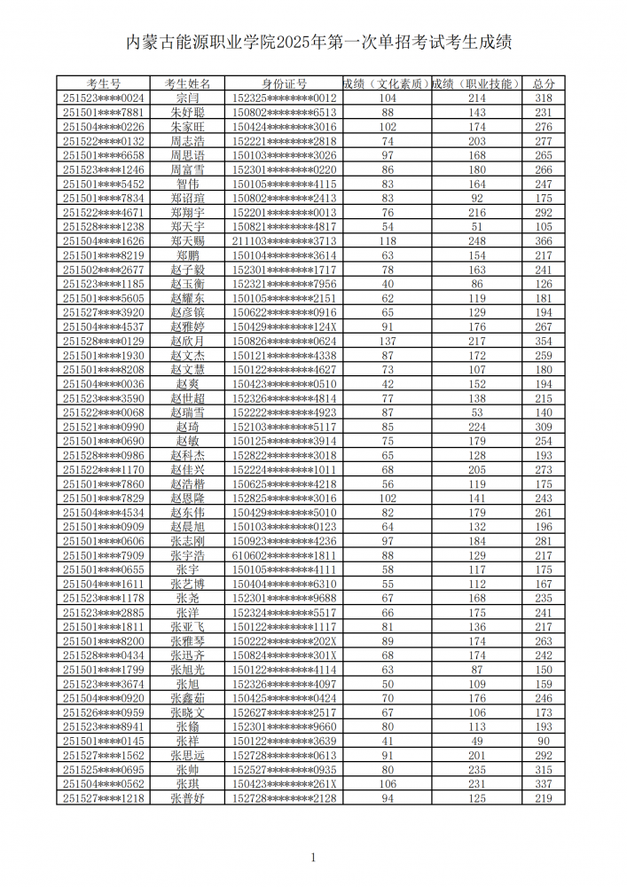 內蒙古能源職業學院2025年第一次單獨招生考試成績