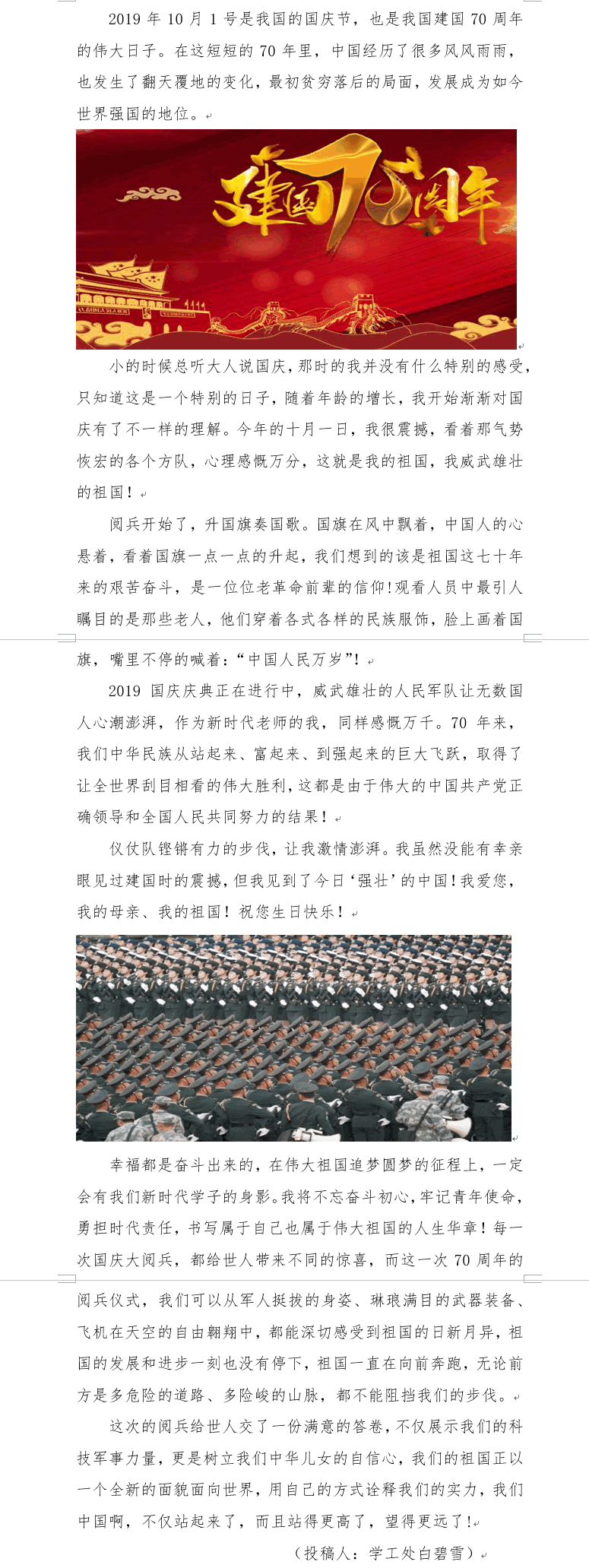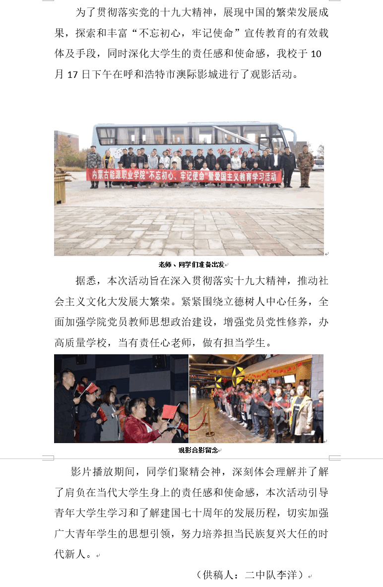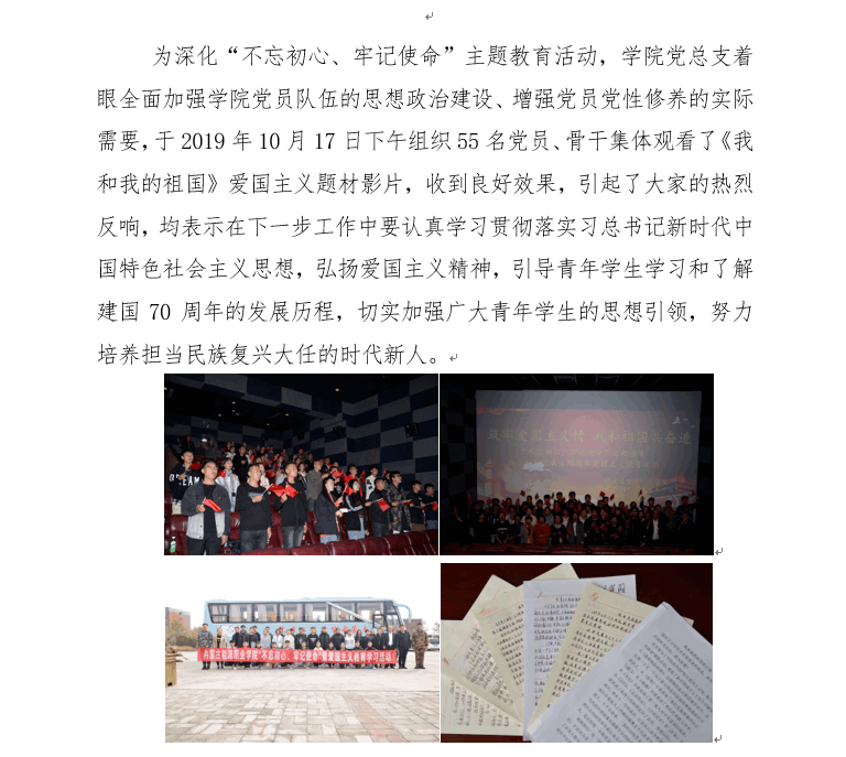 開展“不忘初心、牢記使命”主題教育,是新時代堅持和加強黨的全面領導、全面從嚴治黨、推進新的偉大工程的內(nèi)在要求。根據(jù)上級黨委部署及團市委要求,現(xiàn)制定我院“不忘初心,牢記使命”主題教育活動方案。學院將于2019年10月17日下午組織觀看獻禮70周年愛國主義教育影片《我和我的祖國》。一、活動目的:緊緊圍繞立德樹人中心任務,全面加強學院黨員教師思想政治建設,增強黨員黨性修養(yǎng),辦高質(zhì)量學校,當有責任心老師...