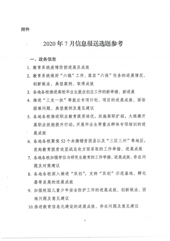 各部門: 根據(jù)辦公廳信息處文件要求,擬訂7月信息報(bào)送選題參考(見附件)。 請(qǐng)結(jié)合選題,對(duì)相關(guān)工作進(jìn)展成效、創(chuàng)新做法、典型案例、困難問題、意見建議等進(jìn)行總結(jié)梳理、分析研判。所報(bào)稿件應(yīng)層次清晰、情況清楚、文字簡練。稿件篇幅原則上不超過3000字,鼓勵(lì)采用數(shù)據(jù)、圖表等說明情況。請(qǐng)各部門高度重視、積極投稿,并于2020年7月25日前通過電子郵件報(bào)送信息中心。聯(lián)系人:庫欣哲電子郵件:15212402@...