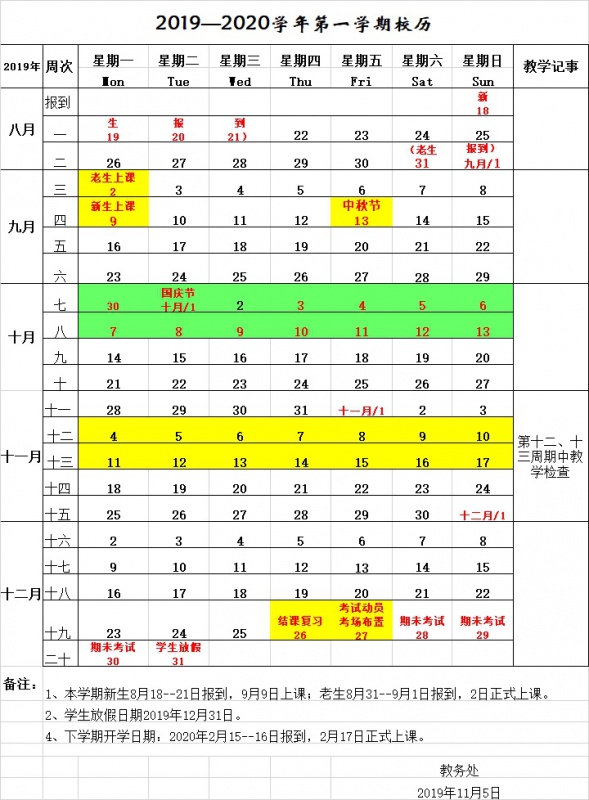 2019—2020學(xué)年第一學(xué)期校歷