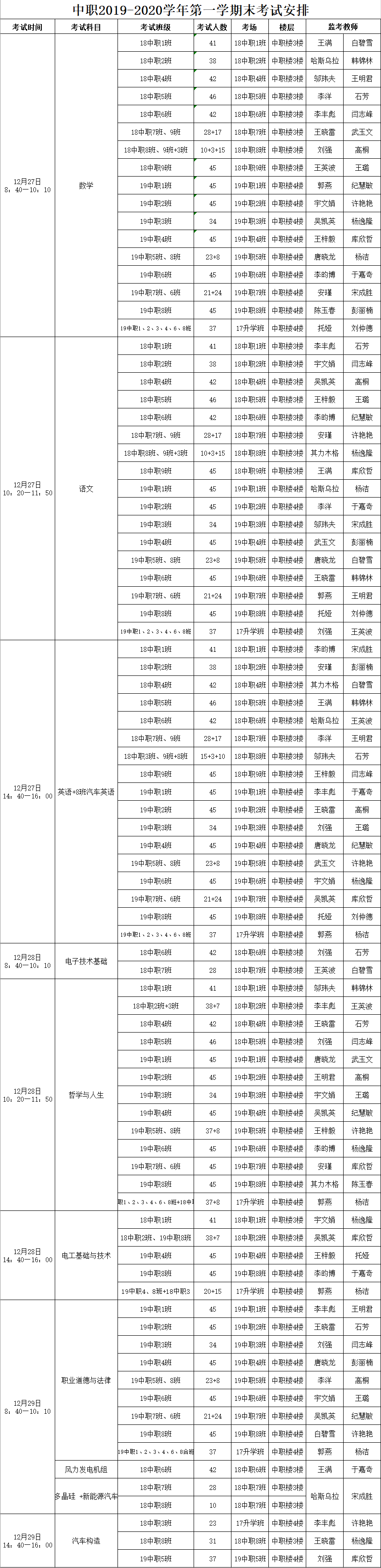 中職2019-2020學(xué)年第一學(xué)期末考試安排